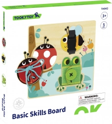 Die fröhliche Holz-Aktivtafel von TOOKY TOY hilft Kindern, Feinmotorik, Hand-Auge-Koordination und alltagspraktische Fähigkeiten zu trainieren. Bunte Tierchen – Biene mit Schnalle, Marienkäfer mit Schnürsenkel und Frosch mit Knopf – motivieren zum spielerischen Lernen. Außerdem gibt es einen Sortierer, bei dem Kinder die Tiere dem richtigen Platz zuordnen.