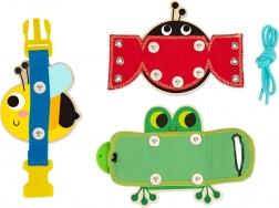 Der Marienkäfer mit Schnürsenkel, die Biene mit Schnalle und der Frosch mit Knopf vermitteln praktische Fähigkeiten spielerisch und stärken die Feinmotorik.