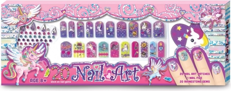 Niedliches Nageldeko-Set mit Einhornmotiv, das jede kleine Stylistin begeistert. Im Set enthalten sind Nagelsticker, eine Nagelfeile und dekorative Steinchen für ein einfaches und kreatives Verzieren.