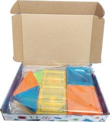 Das Set enthält verschiedene Formen wie Quadrate, Dreiecke, Rechtecke, Sechsecke und mehr, die sich leicht verbinden lassen.