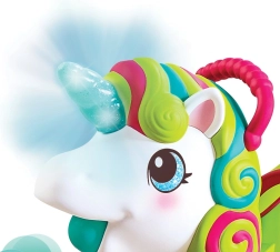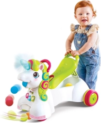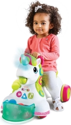 Der Sitz lässt sich für den Gehmodus leicht hochklappen und für das Fahren abklappen; unter dem Sitz und vorne gibt es Platz für Bälle. Das Einhorn kann herumliegende Bälle einsammeln und sie auf den Boden oder in den Korb ausgeben. Die Hinterräder haben 2 Geschwindigkeitsstufen für Anfänger und fortgeschrittene Läufer. Das weiche Horn leuchtet bei Berührung auf und motiviert Kinder zur Interaktion und zum Entdecken.