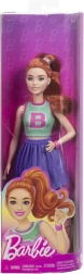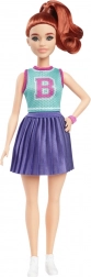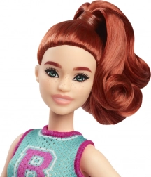 Die vorgestellte Barbie Puppe hat rote Haare in einem seitlichen Pferdeschwanz und inspiriert mit ihrem sportlich-frischen Outfit zur Erkundung modischer Trends. Sie trägt ein türkisfarbenes Trikot mit einem großen 'B' und einem süßen lila Faltenrock, ergänzt durch weiße Sneaker und ein rosa Armband.