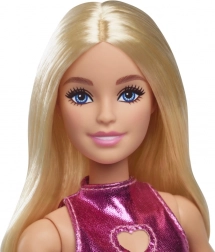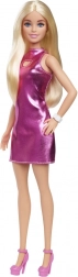 Die Barbie-Puppe hat lange blonde Haare und ein rosa Kleid, das durch das metallische Material und den herzförmigen Ausschnitt sowohl auffällig als auch süß ist.