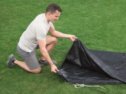 Die Abdeckung ist mit Befestigungsleinen und Drainagelöchern ausgestattet, um auch bei windigem Wetter und Regen sicher an ihrem Platz zu bleiben.