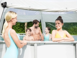 Dank der großzügigen Abmessungen eignet sich der Pavillon auch für größere Aufstellpools – er ermöglicht komfortable Bewegungsfreiheit, die einfache Nutzung einer Poolleiter und dient zugleich als Gartenpavillon für gesellige Runden. Die schnelle Montage in ca. 30 Minuten und die Transporttasche erleichtern die saisonale Nutzung.