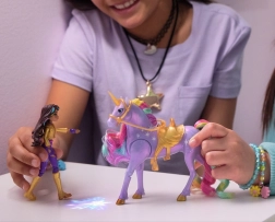 Wildstar ist mit Lichteffekten ausgestattet, die durch Drücken des Sterns an der Seite des Einhorns aktiviert werden. So können Kinder ihre Lieblingsszenen aus den Geschichten nachspielen. Sophia ist mit 7 Bewegungspunkten flexibel, um auf Wildstar zu reiten, das mit dem Huf stampft und ein Regenbogenmuster projiziert.
