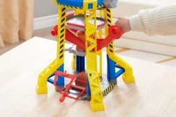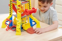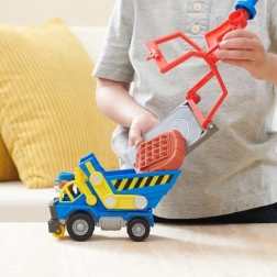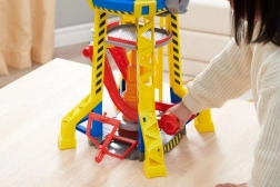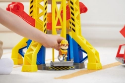 Stellen Sie Rubble in den Aufzug und heben Sie ihn zur Spitze des Turms in die Kranführerkabine. Verwenden Sie den Kran, um Blöcke anzuheben und an den richtigen Ort zu transportieren. Drücken Sie für weitere Überraschungen den großen roten Knopf am Turm, um die Lichter und Geräusche aus der Serie einzuschalten. Für zusätzlichen Spaß suchen Sie nach weiteren Bau-Trucks und Figuren aus der Rubble & Crew-Serie.