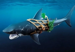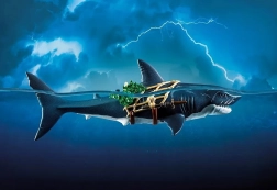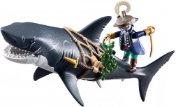 Der Riesenhai mit Pirat von PLAYMOBIL bringt Kindern spannende Geschichten aus den Tiefen des Ozeans. Einfach am Hebel ziehen und das gigantische Maul öffnet sich, bereit, Beute zu „schnappen“; lässt man los, schließt es sich automatisch. Die Piratenfigur hält sich am Netz fest, ist mit Säbel und Dolchen ausgerüstet und für jedes Seegefecht gewappnet.
