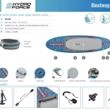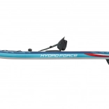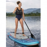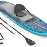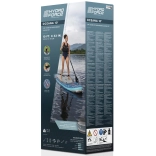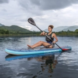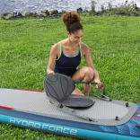 In wenigen Schritten machen Sie daraus ein komfortables Sit-on-Top-Kajak – einfach den Sitz mit Rückenlehne und die Fußstütze befestigen. Integrierte Griffe, elastische Bungeeseile vorne und hinten sowie hintere D-Ringe ermöglichen das Sichern von persönlichen Gegenständen oder einer Kühltasche. Drei abnehmbare Finnen verbessern die Spurtreue, die Sicherheits-Leash mit Schnellverschluss kann am Knöchel oder an der Hüfte getragen werden. Die doppeltwirkende Handpumpe sorgt für zügiges Aufpumpen; nach der Fahrt lässt sich das Board schnell entlüften und im Deluxe-Rucksack verstauen.