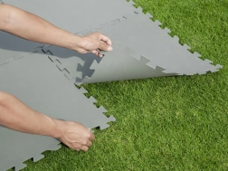 Die einzelnen Teile greifen exakt ineinander; die Unterlage ist in wenigen Momenten verlegt und kann jederzeit nach Bedarf erweitert oder angepasst werden.