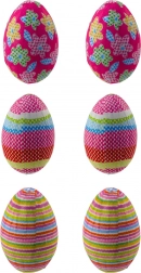 Das Set enthält Eier mit Punkten, Streifen und Blumenmotiven für eine bunte Osterdekoration.