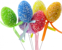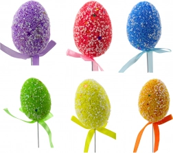 Verleihen Sie Ihrem Zuhause österliche Stimmung mit dem Set aus 6 bunten Eiern am Stab. Jedes Ei ist mit kleinen Kügelchen und dezenten Mustern verziert, die eine attraktive Textur schaffen. Die abgestimmte Satinschleife unterstreicht den eleganten Look und den einheitlichen Stil der Dekoration.