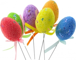 Styropor-Eier mit feiner Körnchenstruktur und dekorativen „Noten“ wirken effektvoll und eignen sich zugleich für die wiederholte Verwendung.