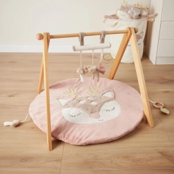 Durchdachte Details fördern die Entwicklung der Feinmotorik und der Sinne – verschiedene Texturen laden zum Anfassen ein, raschelnde Blätter und das rasselnde Rehkitz fördern das Hörvermögen, während der Pilz mit sanftem Summen das Baby fasziniert und beruhigt. Einfache Pflege und hochwertige Verarbeitung sorgen für eine lange Lebensdauer.