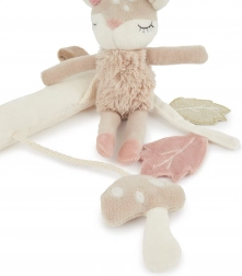 Das niedliche hängende Spielzeug mit dem Motiv des Rehkitzes Ella erfreut Babys von Geburt an und unterstützt ihre Entwicklung. Dank der praktischen Klettverschlüsse lässt es sich leicht am Kinderwagen, Autositz oder an einem Spielbogen befestigen. Das Spielzeug bietet sensorische Stimulation durch verschiedene Texturen und Geräusche: Blätter rascheln, das Rehkitz rasselt und der Pilz vibriert/summt angenehm. Es besteht aus weichem und kuscheligem Polyester, das sanft zur empfindlichen Babyhaut ist.