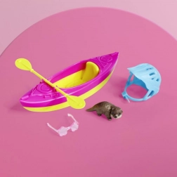 Der bunte Kajak, das doppelseitige Paddel, der Helm und die Sonnenbrille sorgen für realistisches Spiel und viele Geschichten am Wasser.