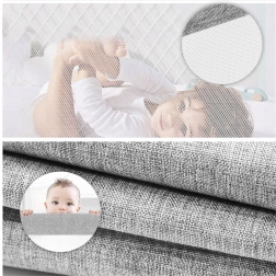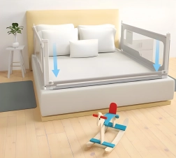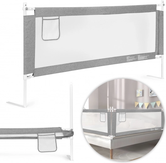 Der obere Teil der Barriere lässt sich einfach per Knopfdruck abklappen, sodass der Zugang zum Bett ohne Demontage möglich ist. Der abnehmbare Bezug kann gewaschen und sauber gehalten werden. Die integrierte Tasche fasst Schnuller, Feuchttücher oder kleine Spielsachen – so ist alles stets zur Hand.