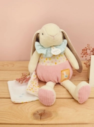 Häschen mit langen, weichen Ohren und einem rosa Cord-Kostüm ist für kleine Kinder gemacht.