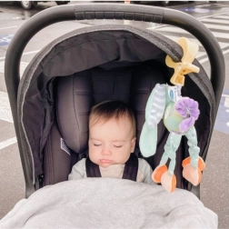 Durch Ziehen am Körper beginnt der Hund sanft zu vibrieren und rasselt bei Bewegung. Das hält die Aufmerksamkeit des Babys und hilft, es während der Fahrt zu beruhigen.
