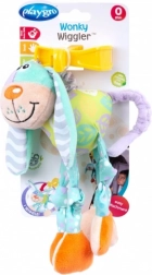Nach dem Ziehen am Körper vibriert der Hund sanft, bei Bewegung schaukelt und rasselt er. Die langen, kontrastreich gemusterten Beine mit farbigen Pfoten laden zum Greifen ein, fördern die Feinmotorik und unterstützen die Sinneswahrnehmung des Babys.