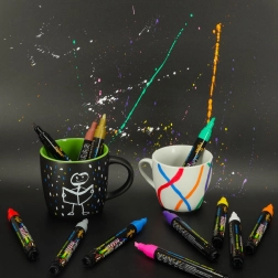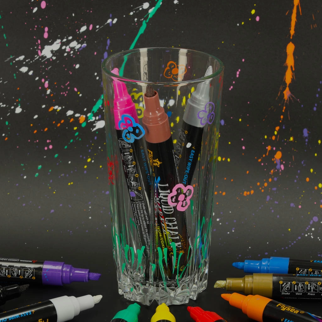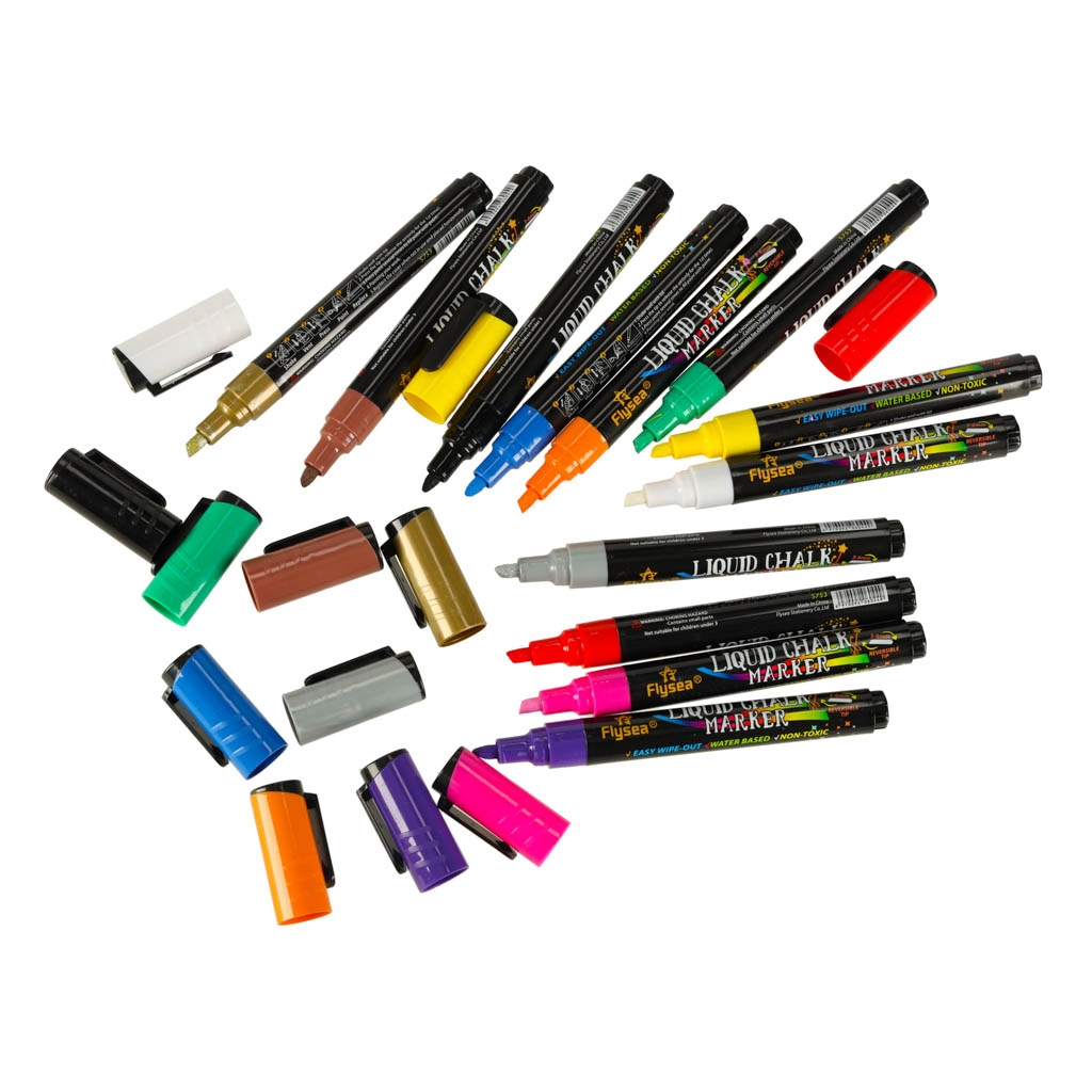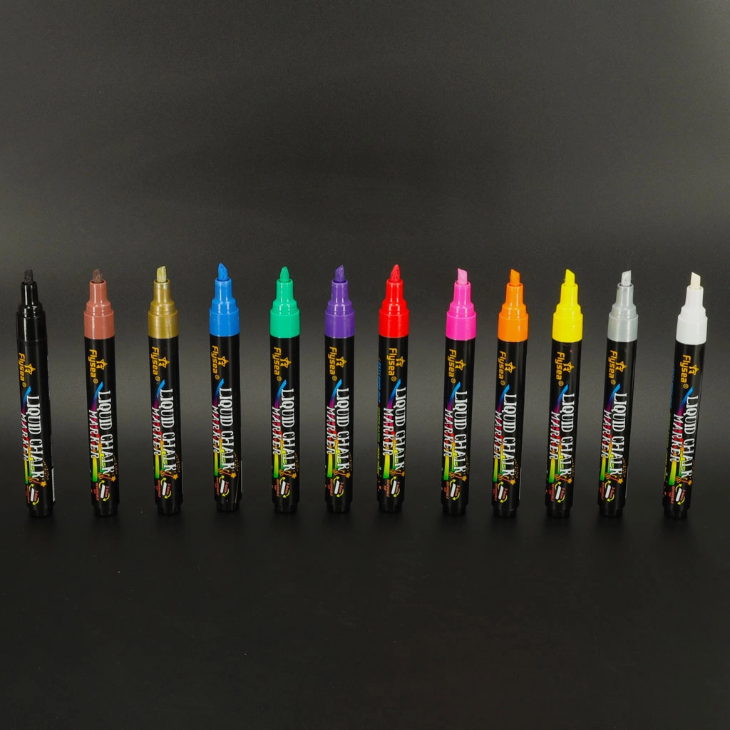 Bringen Sie Farbe in Ihre Ideen mit unserem Set aus 12 bunten Kreidemarkern! Dieses Set enthält 12 lebendige Farbtöne, die sich ideal für Schriftzüge, Illustrationen und Dekorationen eignen. Perfekt zum Verzieren von Schaufenstern, Spiegeln, Whiteboards, Keramikbechern und anderen glatten Oberflächen.