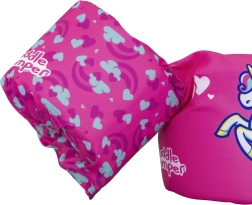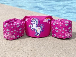 Das pinke Einhorn-Motiv mit Herzchen und Regenbogen motiviert Kinder zum Spielen im Wasser und stärkt ihr Selbstvertrauen beim Schwimmenlernen.