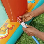 Die bunte Rutsche ist für mehr Sicherheit am Boden des Beckens befestigt, damit sie beim Spielen nicht verrutscht.