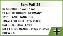 Enthalten sind zwei Minifiguren (deutscher Mechaniker und Artillerist), eine Feldkanone 5 cm PaK 38 und ein Wegweiser EL ALAMEIN, inspiriert von historischen Fotografien. Der Bausatz wird in der EU hergestellt, erfüllt Sicherheitsnormen und ist voll kompatibel mit anderen Marken von Klemmbausteinen.