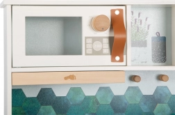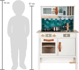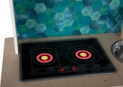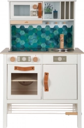Für Freude sorgt das umfangreiche Zubehör: Topf mit Deckel, Pfanne und Küchenutensilien aus Metall. Der herausnehmbare Bräter dient auch als Zeichen-Tafel, Kühlschrank und Ofen besitzen bedruckte Innenflächen für noch mehr Spielspaß. Die Rückwand ist beidseitig – wählen Sie zwischen hexagonalem Fliesendesign oder einer rein weißen Fläche, die in jedes Interieur passt.