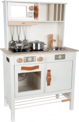 Stilvolle Kinderküche in Weiß mit cognacfarbenen Griffen für realitätsnahes Spielen kleiner Köche. Bietet eine elektronische Kochplatte mit Licht und Sound, drehbare Klick-Knöpfe, ein Spülbecken aus Metall und umfangreiches Zubehör inklusive Topf, Pfanne und Metallbesteck. Mit ausziehbarer Dunstabzugshaube mit Lichtsymbol, herausnehmbarem Bräter als Tafel und beidseitigem Rückwandpanel mit modernem Fliesendruck.