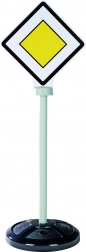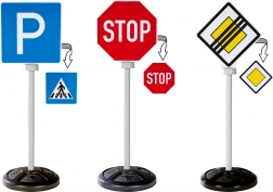 Das Set enthält drei stabile Schilder, jedes mit einem beidseitigen Druck, der insgesamt fünf realistische Verkehrssymbole darstellt: STOP, Vorfahrtstraße, Ende der Vorfahrtstraße, Parkplatz und Fußgängerüberweg.