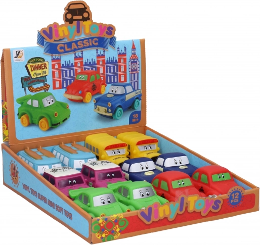 Leichtes Spielzeugauto aus weichem Kunststoff mit einer Länge von 9 cm und Freilauf-Rädern. Es gibt 6 Varianten: Käfer, Trabant, Sportwagen, Mini, Bus, Lieferwagen. Auch erhältlich als Display-Box mit 12 Stück.