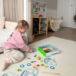 Ein bunter Würfel und Karten bringen Regeln ins Spiel: Kinder angeln Farben, setzen Puzzle-Elemente auf ihre Tafeln und lernen abwechselnde Züge sowie die Unterscheidung von Farben.