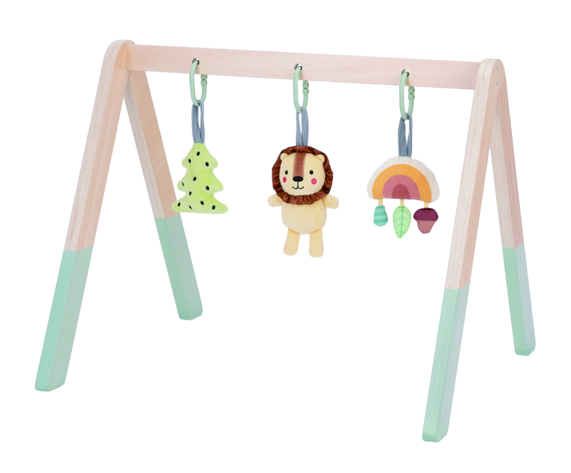 Zum Set gehören ein farbiger „Bäumchen“-Anhänger mit Knistereffekt, ein niedlicher Löwe mit Rassel und Glöckchen sowie ein schimmernder Regenbogen mit drei kleineren Elementen in verschiedenen Texturen und Farben, der beim Drücken quietscht. Alles ist in Pastellfarben gehalten und mit kindersicheren Farben lackiert.