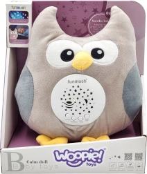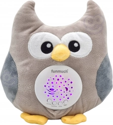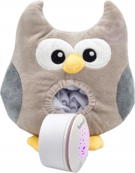 Die Plüscheule vereint Nachtlicht, Projektor und Soundmodul in einem. Der weiche Körper aus angenehm anzufassendem Material ist mit Watte gefüllt und daher ideal zum Kuscheln. Am Bauch projiziert sie zarte Sternchen und einen Mond mit wechselnden Farben und spielt gleichzeitig Schlaflieder oder weißes Rauschen einschließlich Herzschlag zur natürlichen Beruhigung.