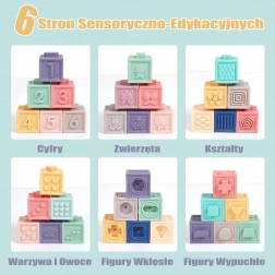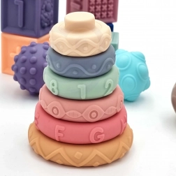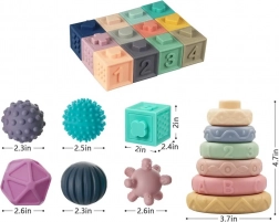 Weiches Silikon mit verschiedenen Texturen, Farben und Formen stimuliert Tastsinn, Sehen und Hören. Die quadratischen Würfel quietschen beim Drücken und motivieren zum weiteren Erkunden.