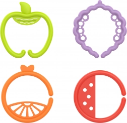 Das Set aus 4 farbigen Obst-Ringen bietet Babys ab der Geburt sicheres Kauen, spielerisches Verbinden und praktisches Aufhängen von Lieblingsspielzeugen. Mit einem einfachen Klick entsteht eine Kette in beliebiger Länge, die sich leicht am Kinderwagen oder Sitz befestigen lässt. Unterschiedliche Farben, Texturen und Formen stimulieren die Sinne und unterstützen die Hand-Auge-Koordination.