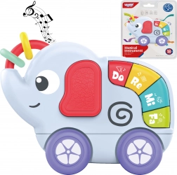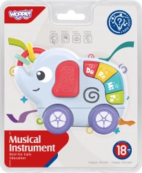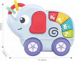 Der interaktive Elefant kombiniert die Funktionen eines sensorischen Spielzeugs und eines Beißrings in einem. Vier bunte Tasten spielen Klänge von Musikinstrumenten (Do, Re, Mi, Fa), während Raschelelemente und drehbare Räder die natürliche Neugier des Kindes fördern. Das weiche Ohr und der Rüssel mit Ringen sind aus sanftem, sicherem Kunststoff, der sich angenehm zum Kauen eignet.