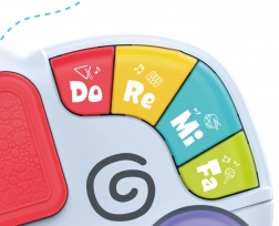 Vier bunte Tasten spielen Töne und Klänge von Musikinstrumenten ab, die Gehör und musikalisches Empfinden Ihres Kindes fördern.