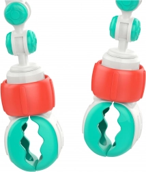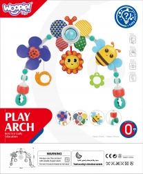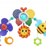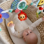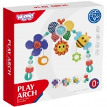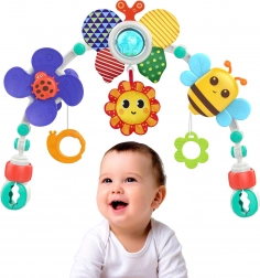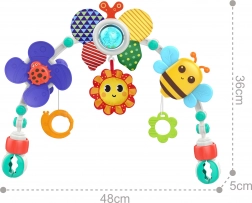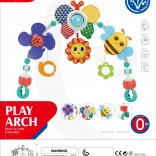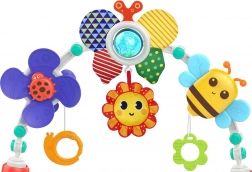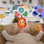 WOOPIE Bogen mit Spielzeug ist so konzipiert, dass er Kindern nicht nur Spaß, sondern auch Entwicklung bietet. Auf dem Bogen finden Sie verschiedene Spielzeuge wie ein Windrad mit Marienkäfer, das sich dreht und vibriert bei Bewegung, eine quietschende Sonne bei Berührung, ein Rassel-Schmetterling mit transparenter Kugel, in der bunte Kugeln springen, sowie raschelnde Materialien, die das sensorische Erlebnis des Kindes bereichern.