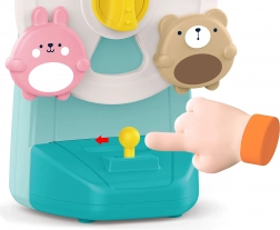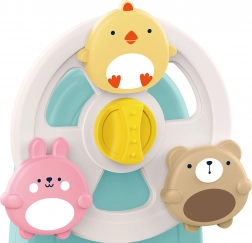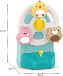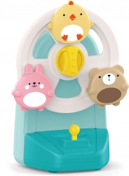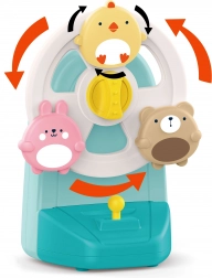 Mit dem gelben Regler aktiviert das Kind mühelos den Drehmechanismus, beobachtet die Bewegung der Tierfiguren und trainiert die Feinmotorik sowie die Auge–Hand-Koordination.