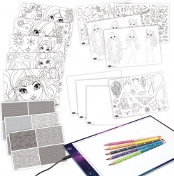 - Tablet, USB-Kabel, 5x doppelseitige Buntstifte, 1x schwarzer Marker, inspirierende Bögen