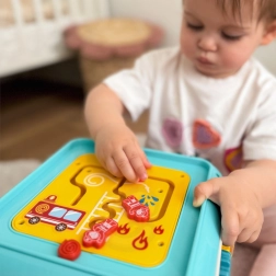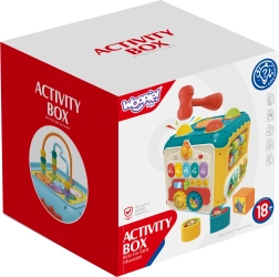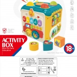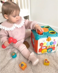 Auf einer Seite befindet sich ein Klavier, auf dem das Kind Tasten mit angenehmen Klängen spielen kann. Eine weitere Attraktion ist ein Hammer-Spiel, bei dem Kinder mit einem Hammer bunte Bälle in den Würfel hineinklopfen.