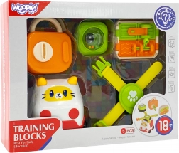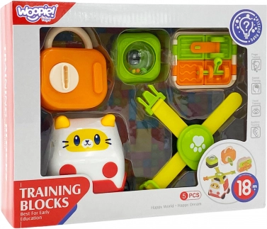 Das Set umfasst 4 interaktive Bausteine: ein orangefarbenes Schlöschen mit Schlüssel zum Üben von Griff und Koordination, Fenster mit Riegel und Schiebesicherung zum Erkunden von Ursachen und Folgen, ein drehbares Element mit Kügelchen zur visuellen Stimulation sowie Riemen mit Schnallen und Schlaufen, die an einen Propeller erinnern, zum Üben des Schließens. Alles besteht aus robusten und sicheren Materialien, die für kleine Kinder geeignet sind.