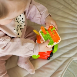 Die orangefarbene Tropfenform mit Kügelchen und echter Schließfunktion lehrt Kinder präzisen Griff, Koordination und Geduld auf spielerische Weise.
