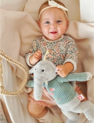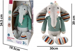 Der interaktive Plüschelefant Woopie ist mit drei sensorischen Zonen an den Beinen und am Bauch ausgestattet, die bei Berührung Musik abspielen. Seine rosa Gesichter sind beleuchtet, was um das Spielzeug eine magische Atmosphäre schafft. Der Plüschelefant ist in einen Pullover gekleidet, unter dem Platz für 3 Batterien ist. Dieser weich anzufassende kleine Elefant wird ein Freund des Kindes für viele Jahre.