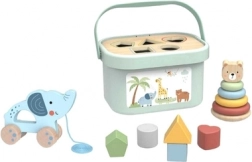 Dieses vielseitige Set fördert die kindliche Entwicklung durch Spiel: Kinder sortieren Formen in den Deckel der Sortierbox, stapeln buntfarbige Ringe auf die Stange der Bären-Pyramide und trainieren das Laufen sowie die Koordination mit dem Zieh-Elefanten. Nach dem Spielen wird alles im verschließbaren Box mit Griff verstaut – Ordnung in wenigen Augenblicken.