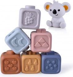 Weiche sensorische Silikonbausteine von WOOPIE in zarten Pastellfarben fördern die frühe Entwicklung Ihres Kindes von Geburt an. Sechs Würfel mit erhabenen Zahlen schulen Tastsinn, Sehen und Logik; das sichere Material dient auch als Beißring beim Zahnen. Die Würfel lassen sich stapeln, drücken (sie quietschen), dank Reliefs verbinden und machen auch bei Wasserspielen Spaß. Ein niedlicher Koala verleiht dem Set verspielten Charme.