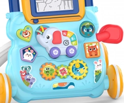 Der Lauflernwagen enthält auch ein Set von Blöcken unterschiedlicher Formen mit Bildern von Tieren, was in das Spiel das Lernen von Formen, Farben und Tieren einführt. Das bewegliche Zahnrad dreht sich, wenn das Kind damit spielt, und bringt ein Überraschungselement.