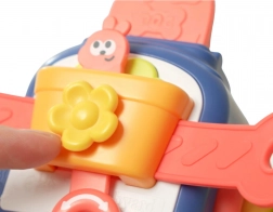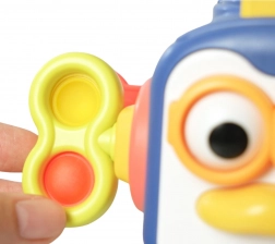 Der runde Pinguin enthält bewegliche Elemente - beim Drücken der Nase schnurrt das Spielzeug und die Augen beginnen sich zu bewegen.
